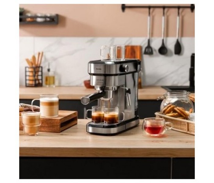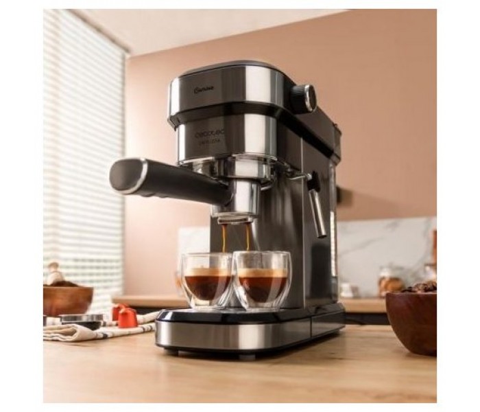 Cafetera espresso con diseño elegante y compacto para los amantes del buen café. Permite hacer todo tipo de cafés con una potencia máxima de 1350 W y también emite agua caliente para infusiones.