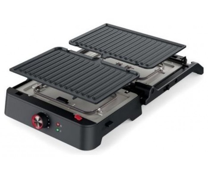 Placas desmontables - Abertura de 180ºTiene una superficie de cocción de 27,5 x 18 cm, termostato regulable y, gracias a su apertura de 180º, también puede utilizarse como parrilla de mesa. Al ser desmontables las placas, su limpieza después del uso es muy fácil. 1800 vatios de potencia.