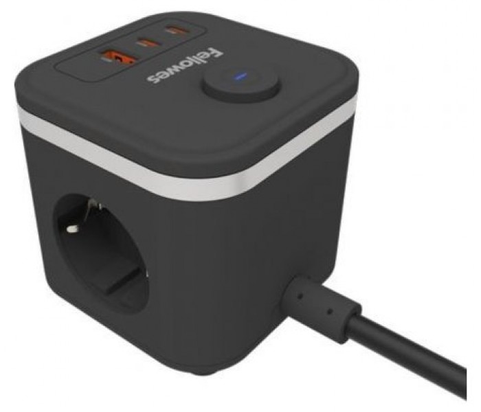 - Incluye 3 tomas de corriente (230 V), 1 puerto USB A (18 W máx.), 2 puertos USB C (20 W máx.) y un interruptor de encendido/apagado.