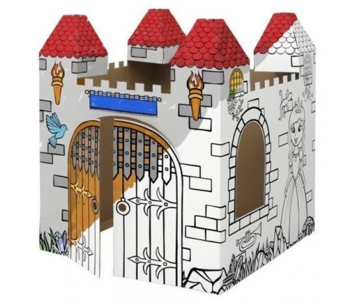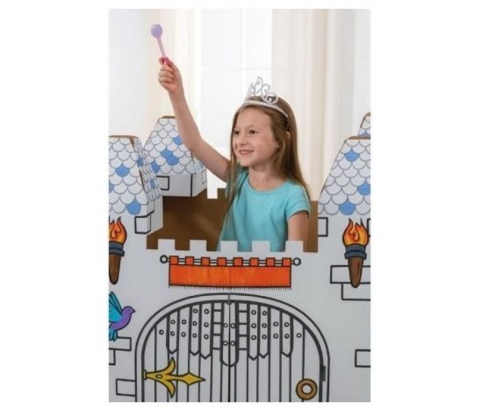 Castillo fabricado en cartón resistente y reciclable con certificado FSC impreso con tintas no tóxicas. Con bordes redondeados de seguridad. Fácil montaje en 5 piezas sin necesidad de cinta adhesiva o pegamento. Diseño interactivo, se pueden abrir puertas.