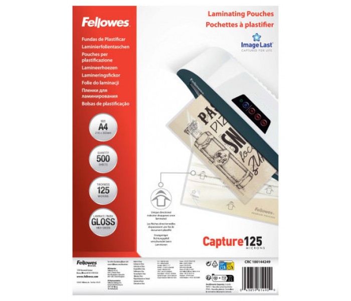 PACK 500 FUNDAS PLASTIFICAR 125 MICRAS BRILLO A4 (216X303 MM) FELLOWES 100144249