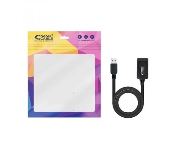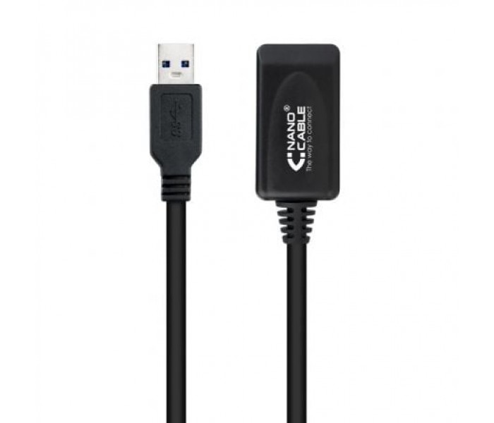 Especificaciones:. Cable prolongador USB 3.0 con conector tipo A macho en un extremo y tipo A hembra en el otro.. Lleva amplificador para amplificar la señal de USB.. Máxima velocidad de transferencia: 5Gbps.. Es una solución ideal para necesidades de cable USB con longitud de más de 5 metros hasta un máximo de 20 metros (uniendo 4 cables prolongadores con alimentador).. No requiere software ni controladores, una solución totalmente plug and play.. Compatible con USB 2.0.. Longitud: 5 m.. Color: negro.. Normativas: RoHS.. Test de Funcionamiento: 100% testado.. Contenido del embalaje:. 1 x Cable USB 3.0 prolongador con amplificador, tipo A/M-A/H, 5 m