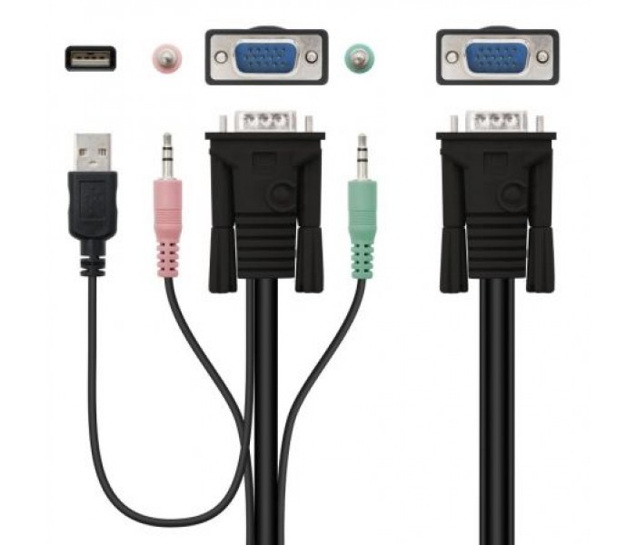 Especificación:. Conexiones CPU: 2 Sub-D 15pin macho, 2xUSB macho, 4x Jack 3.5. Conexiones consola: 3xUSB hembra + 1 VGA HDB 15pin hembra + 2 Jack 3.5. Cables incluidos: 2xVGA, 2xJack 3.5(auriculares), 2xJack 3.5(micrófono), 2xUSB. Resolución máxima:1920x1440, ancho de banda: 250 Mhz. Indicador LED para comprobación de estado. Selección de PC mediante botón o comando de teclas. Requisitos mínimos de sistema: Monitor, teclado y ratón USB, 2 ordenadores (PC u ordenador portátil) con puerto USB 1.1 o 2.0 libre. Longitud: 1.4 metros. Color: Negro. NormativaS: RoHS. Test de Funcionamiento: 100% testado
