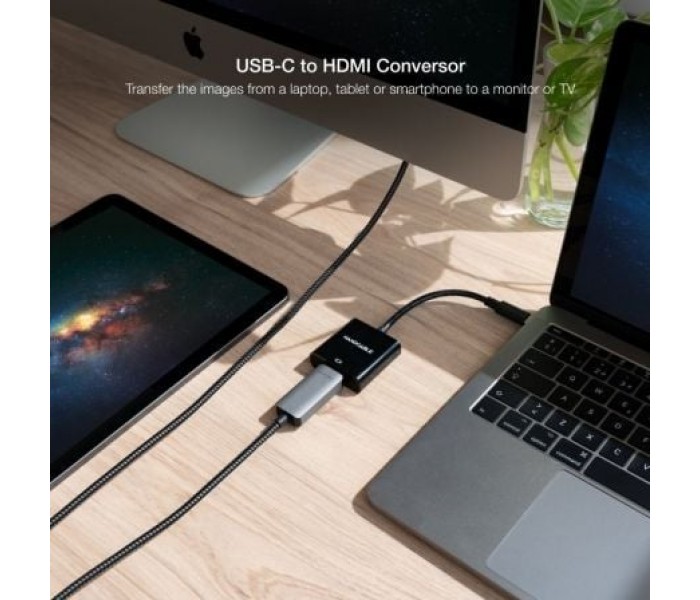 Conversor USB-C a HDMI, con conector USB Tipo-C macho en un extremo y HDMI 4K hembra en el otro.. .