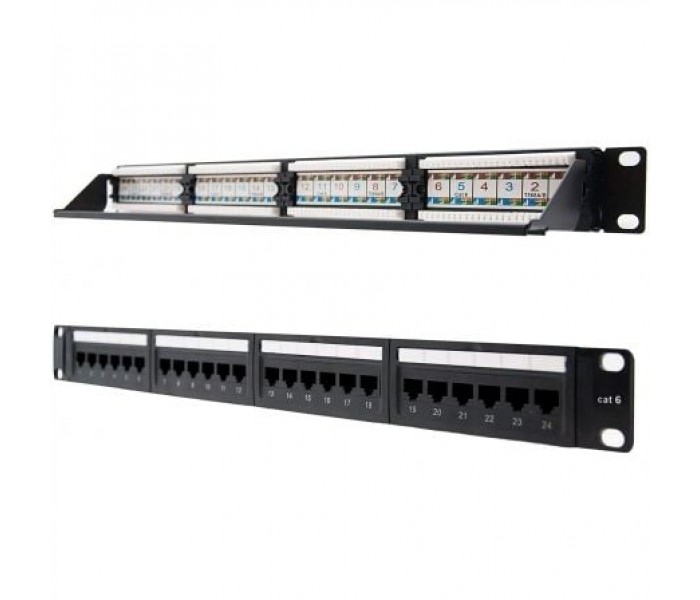 - 1 x Panel de parcheo de 24 puertos rj45 cat.6 utp, 19" 1u dual idc, negro