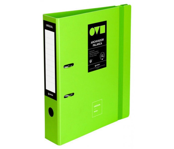 Archivador A4 65 mm Unequal Minimal Color verde. Este archivador tiene sus cubiertas realizadas en polyfoam, un material resistente y ultraligero. Permite una apertura 360º y cuenta con un tarjetero en lomo con cartulina impresa pegada, mecanismo de palanca niquelado, ollao y rados. Tiene también un práctico cierre con goma plana, que impedirá que se pierdan todos sus documentos.