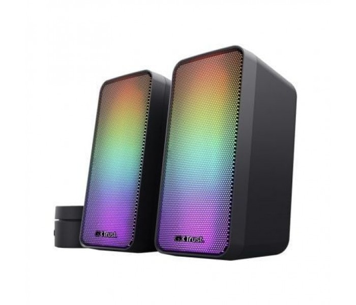 «Visualiza» el sonido con este atractivo juego de altavoces con iluminación RGB pulsante y un sonido nítido. . Especificaciones:. . Features. . Power saving: no. NFC: no. Hands-free phone calls: no. Tripod mount: no. Special features: RGB. . Size & Weight. . Total weight: 780 g. Weight of main unit: 780 g. Depth of main product (in mm): 95 mm. Width of main product (in mm): 87 mm. Height of main product (in mm): 165 mm. . Control. . Remote control: wired. Controls: on/off, volume control, right. . Connectivity. . Connection type: wired. Cable length power cable: 180 cm. Cable length audio cable: 180 cm. Cable length satellite cable: 120 cm. . Audio. . Power output (peak): 12 W. Power output (RMS): 6 W. Power output - satellite (RMS): 3 W. Frequency response: 20 Hz - 20.000 Hz. Driver units: 2. Audio input: 3.5 mm. Audio output: None. Headphone connection: no. Microphone built-in: no. Microphone connection: no. Speaker impedance: 4 Ohm. Input impedance: 10 Ohm. . Lighting. . Lights: yes. Light modes: On/off, Patterns, EQ, Colour. . Protection. . Waterproof: no. . Power. . Power cable detachable: no. . Input. . Power source: USB. . Satellites. . Satellite Height (mm): 165 mm. Satellite Width (mm): 78 mm. Satellite Depth (mm): 95 mm. . Compatibility. . Compatible Device Types: laptop, pc, smartphone, tablet. Compatible Consoles: no