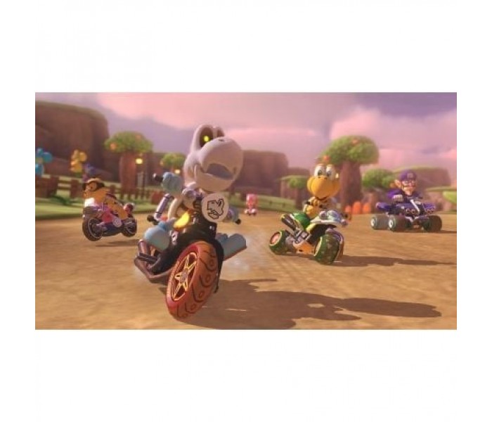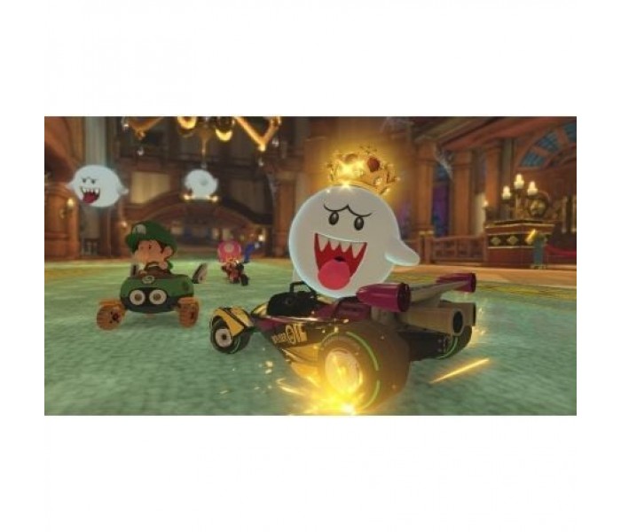 Los populares circuitos y personajes de la versión de Wii U están de vuelta, junto a los circuitos y personajes descargables, y además se unen a la parrilla personajes nuevos: Inkling chico e Inkling chica, de Splatoon, el Rey Boo, Huesitos y Bowsy. Por otra parte, el modo batalla se renueva por completo con la batalla de globos y el Bob-ombardeo, y con la inclusión de circuitos inéditos como el Parque Viaducto o el Estadio de Batalla, que se unen a viejos conocidos como la Mansión de Luigi (GCN) y el Circuito de Batalla 1 de Super Mario Kart (Super Nintendo Entertainment System).