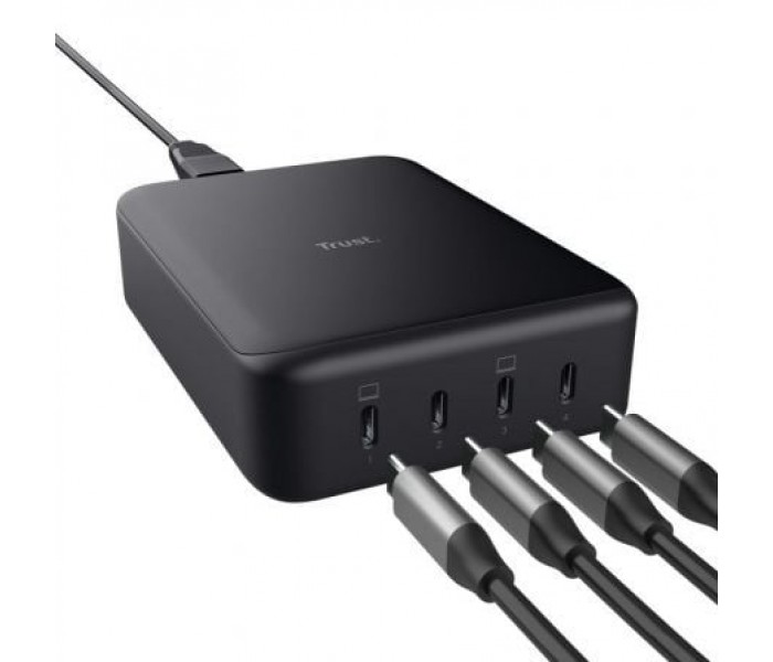 Carga todo lo que necesites en tu oficina o en casa con este potente cargador de 240 W. . Diseño sostenible, fabricado con un 50 % de plásticos reciclados para reducir el impacto medioambiental. . Alimenta hasta 4 dispositivos a la vez gracias a los 4 puertos USB-C. . Con un máximo de 140 W por puerto, este cargador puede alimentar todo tipo de portátiles, tabletas, teléfonos y mucho más. . Disfruta de una carga rápida para tus dispositivos USB-C gracias a la compatibilidad con Power Delivery (PD), Programmable Power Supply (PPS) y Extended Power Range (EPR)* . La tecnología GaN ofrece una gran potencia de salida en un formato compacto. . Sustituye la necesidad de 4 cargadores de pared individuales, por lo que reduce la energía en espera, el desorden de cables y simplifica tu equipo de carga. - El cable de alimentación de 1 m te permite colocar el cargador donde quieras. . La velocidad de carga varía según los dispositivos y los cables compatibles.. . Especificaciones:. . Plastic material PC/ABS. Sustainability method PCR. Total weight 718 g. Weight of main unit 718 g. Height of main product (in mm) 35 mm. Width of main product (in mm) 88 mm. Depth of main product (in mm) 122 mm. Number of USB ports 4. Cable length power input 100 cm. Power plug type EU. Input power 240W. Charging technology USB PD 3.0 + PPS. Max output amperes 5 A. Output voltage 5 9 15 20. Total max output power (W) 240 Watt. Power cable length 120 cm. Laptop voltage range 5 - 28 V. Compatible Device Types accessories laptop tablet smartphone Bluetooth devices. Power Factor Control Yes