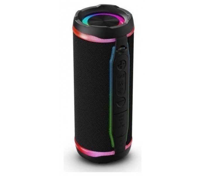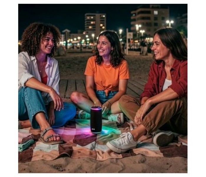 Altavoz Bluetooth con 25 W de potencia y dos grandes diafragmas para un sonido sublime, luces sincronizadas con la música opcionales, 20 horas de duración de la batería, alta resistencia al agua y asa integrada para un transporte cómodo.