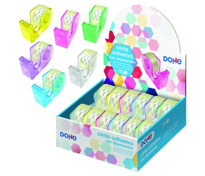 EXPOSITOR CON 12 DISPENSADORES DE CINTA ADHESIVA. COLORES SURTIDOS (AMARILLO, MORADO, AZUL, VERDE, ROSA Y TRANSPARENTE). CINTA ADHESIVA DE 18 MM X 20 M.