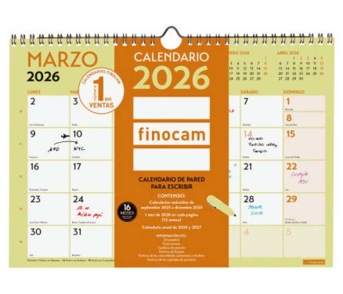 Calendario anual de pared a todo color encuadernado con espiral doble y con colgador. Con un toque moderno para aportar un ambiente casual a tu organización. Contiene información útil y de interés, espacio diario para anotaciones y con mes anterior y posterior en cada página. Perfecto para planificar tus días. Ideal para la oficina o el hogar. Duración: Enero 2026 - Diciembre 2026 (12 meses) + Sep.-Dic. 2025 (4 meses) reducidos. Interior: Mes Vista. Para planificarse a nivel mensual. Con información de los festivos de España. La anualidad del calendario incluye la información relativa a: onomástica, festivos nacionales, festivos de las CC. AA., días señalados, fases lunares y cambios de estación. Detrás de la hoja de cada mes se puede consultar el calendario anual. El calendario dispone también de otros contenidos extra: calendarios reducidos de septiembre a diciembre del año anterior, calendario anual del año y del año siguiente, planning anual, listado de festivos de las CC. AA. y de las capitales de provincia e inicios de los años nuevos chino, musulmán, ortodoxo y hebreo. Idioma del artículo: español. Formato: A4 - 297x210 mm. Papel y espiral doble metálica. 120 g/m². Papel FSC®.