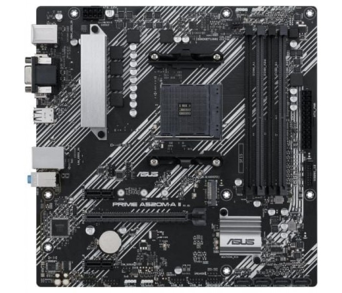 ASUS PRIME A520M-A II/CSM. Fabricante de procesador: AMD, Socket de procesador: Zócalo AM4, Procesador compatible: AMD Ryzen™ 3, AMD Ryzen™ 5. tipos de memoria compatibles: DDR4-SDRAM, Memoria interna máxima: 128 GB, Tipo de ranuras de memoria: DIMM. Interfaces de disco de almacenamiento soportados: M.2, SATA III, Tipos de unidades de almacenamiento admitidas: HDD & SSD, Niveles RAID: 0, 1, 10. Conector USB: USB tipo A. Tipo de interfaz ethernet: Gigabit Ethernet