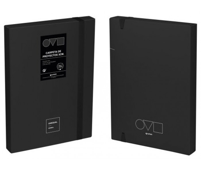 Caja proyectos Unequal Minimal color negro. Esta caja de proyectos tiene unas cubiertas realizadas en polyfoam, material resistente y ultraligero, tamaño folio, apertura 360º, cierre con goma plana y lomo de 30 mm.