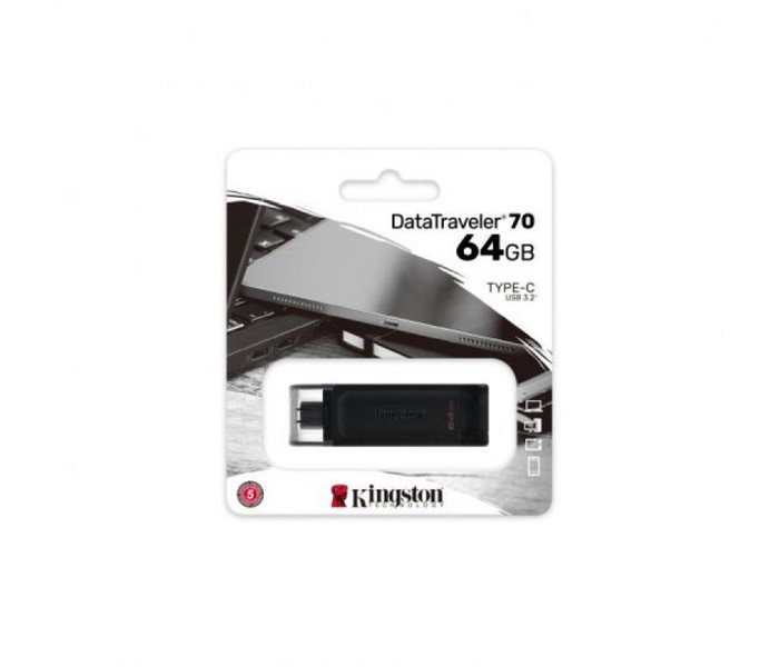 DataTraveler 70 de Kingston es una pequeña y ligera unidad Flash USB-C que alcanza velocidades de USB 3.2 Gen 1. Ha sido diseñada para dispositivos compatibles con USB-C, como notebooks, portátiles, tabletas y teléfonos inteligentes. Con capacidades de hasta 128 GB, DataTraveler70 le permitirá ampliar el almacenamiento para el uso cotidiano. Además, está respaldada por una garantía de 5 años y asistencia técnica gratuita.Almacenamiento USB-C