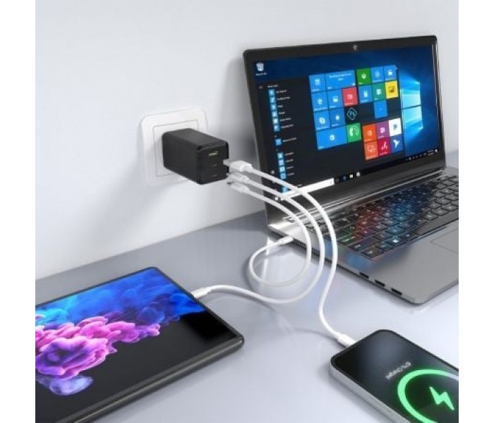 Este cargador puede cargar simultáneamente 3 dispositivos USB-A y USB-C a máxima velocidad.