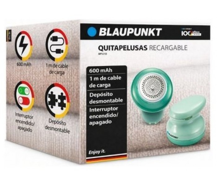 Blaupunkt BP5018 es un quitapelusas recargable para ropa y tapiceríascon depósito desmontable, tapa protectora, interruptor ON/OFF ypuerto de carga USB. Funciona con batería Ni-MH de 2,4 V (2×600mAh) e incluye cable de carga de 1 m para un uso cómodo y continuoen el hogar.