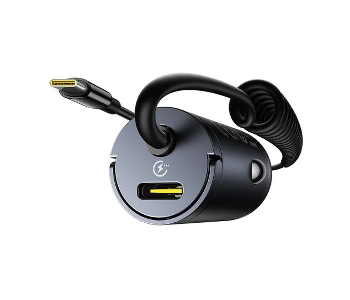Cargador coche - Baseus Tiny Star Mini, 30W, Tipo-C, Carga rápida, Con cable rizado incorporado, Multidispositivo, Universal, Negro Cosmic.