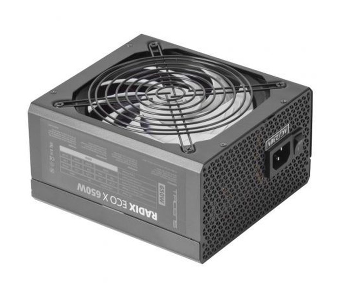 SILENCIO ABSOLUTO. AI-RPM Y 140MM FDB.. Equipada con la última tecnología en control de ventiladores AI-RPM ideal para garantizar un funcionamiento sin ruido, la RADIX ECO X 650 cuenta con control térmico inteligente de última generación basado en algoritmos avanzados y sistemas de control multinivel para mantener el ventilador al mínimo. Además, la RADIX ECO X 650 cuenta con un ventilador XL de grado industrial y 140mm con rodamiento de fluido dinámico y motor extragrande para maximizar su estabilidad. Toda la tecnología disponible para asegurar el mínimo ruido y la máxima eficiencia y durabilidad.. . EFICIENCIA PROFESIONAL. Con una eficiencia del 99% en el sistema DIGITAL APFC y un 87% de eficiencia eléctrica lograrás un perfecto equilibrio entre eficiencia y consumo. Además, su tecnología de raíl único +12v te permitirá instalar el hardware más exigente.. . DISEñO DE CABLES OPTIMIZADO. Los cables de la RADIX ECO X 650 son planos, negros y extralargos: una combinación de prestaciones que hacen su instalación no solo más fácil que nunca, sino además totalmente versátil para cualquier montaje en cualquier tipo de caja. Construye el PC definitivo con una torre de gran tamaño y disfruta de tus partidas a lo grande.. Especificaciones:. Potencia: 650W. AC input: 200-240V 50-60Hz. PFC: Activo. Eficiencia: +87%. Ruido: 12dB. Factor de forma: ATX. Ventilador: 140mm. Rail: 12V único. Certificaciones: ATX12V, Haswell Ready, CE, ROHS. Protecciones: OPP, OVP, UVP, SCP, OCP, OTP, OLP, SCP, NLO, PFP, TCP. Cables: 1x20 + 4 pin, 1x12V 4 + 4 pin, 4xSATA, 2xPATA, 2x PCIe 6+2 pin. Dimensiones: 150x160x85mm/ 1360g. Extra: Control AI-RPM del ventilador y cables planos extra largos