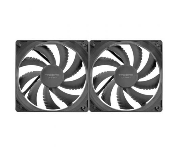 . . Tipo de producto: Ventilador interno para ordenador. Dimensiones del ventilador: 120 mm x 120 mm x 25 mm. Nivel de ruido (mín.): 14 dB. Tecnología de rodamiento: Fluxus Bearing. Tecnología de aspas: Air-Guide. Conector: 3-pin (algunas variantes pueden incluir un adaptador a Molex de 4-pin). Voltaje: 12 V DC. Corriente: No especificado. Velocidad del ventilador: No especificado (típicamente entre 800-1200 RPM para este nivel de ruido). Flujo de aire: No especificado. Color: Negro (generalmente). Dimensiones y peso:. Dimensiones (por ventilador): 120 x 120 x 25 mm. Peso (por ventilador): No especificado. Peso del paquete (aproximado): No especificado. Incluye:. 2 Ventiladores Tacens Anima AF12X2.. Tornillos de montaje.