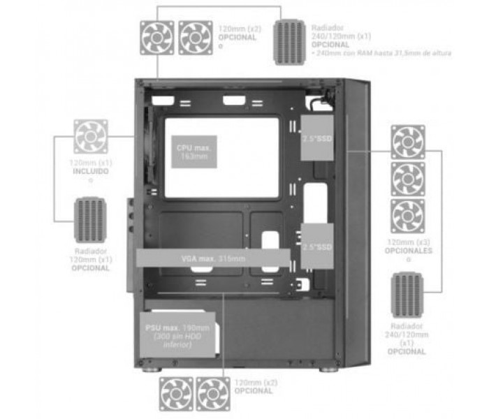 Descubre la caja semitorre MC-iPRO, donde un diseño elegante y profesional se une a una funcionalidad revolucionaria. Escoge entre un elegante color negro o blanco, y disfruta de un flujo de aire superior a través de una impresionante rejilla frontal tridimensional y contempla tus componentes a través del panel lateral de cristal templado. La caja admite placa base ATX, cuenta con una eficaz gestión del cableado y ofrece un amplio espacio de almacenamiento. Con soporte para refrigeración avanzada y puertos de conectividad de fácil acceso, la MC-iPRO es un ejemplo de cajas para PC modernas.. Características principales:. DISEñO PROFESIONAL CON CRISTAL TEMPLADO. Libera el potencial de tu ordenador con la semitorre MC-iPRO, una caja que fusiona diseño profesional y funcionalidad. La MC-iPRO cuenta con un panel frontal metálico y una ventana lateral completa de cristal templado que muestra los componentes de tu sistema en todo su esplendor. Ya seas gamer o trabajador profesional, la clara visualización del corazón de tu PC no sólo inspirará tu trabajo, sino que también impresionará a todos los espectadores.. DISEñO DE REJILLA FRONTAL TRIDIMENSIONAL. La MC-iPRO cuenta con una llamativa rejilla metálica frontal de diseño tridimensional, concebida para mejorar el flujo de aire hacia los componentes críticos de tu sistema. Combinada con la ventana lateral de cristal templado, la MC-iPRO es una maravilla del diseño que mantiene tu sistema a temperaturas óptimas con un aspecto impresionante.. AMPLIA CAPACIDAD INTERNA. Gestionar los cables de tu sistema nunca ha sido tan fácil gracias al sistema interno de gestión de cables de la MC-iPRO. Mantén tu configuración limpia y organizada, mejorando el aspecto de tu configuración y el flujo de aire. Compatible con placas base ATX, MicroATX y Mini-ITX, junto con 7 ranuras de expansión y capacidad para para 2 discos duros de 3,5"" y hasta 4 SSD de 2,5"", la MC-iPRO ofrece versatilidad para construir una amplia gama de sistemas, desde estaciones de trabajo de alta potencia hasta equipos gaming de alto rendimiento.. REFRIGERACIóN AVANZADA ULTRASILENCIOSA. Mejora la gestión térmica de tu sistema con la caja MC-iPRO, diseñada para un funcionamiento silencioso y una capacidad de refrigeración superior con diseño de doble cámara que permite separar la fuente del resto de componentes. Además, diseñada para soportar sistemas de refrigeración líquida en la parte superior, frontal y trasera, y alojar hasta 8 ventiladores de 120 mm, la caja MC-iPRO viene equipada con un ventilador ultrasilencioso FDB de 120 mm, que ofrece una experiencia informática silenciosa y garantiza una refrigeración total de tu sistema.. CONECTIVIDAD SUPERIOR. La caja de PC MC-iPRO garantiza que siempre esté conectado con un panel superior equipado con un puerto USB 3.0, dos puertos USB 2.0 y entradas de audio HD y micrófono. Estos puertos fácilmente accesibles, mantienen tus dispositivos y periféricos esenciales al alcance de la mano, agilizando el trabajo y experiencia de juego.. Especificaciones:. Dimensiones: 367x451x202mm. Peso: 4.25Kg. Tamaño: Semitorre. Ventana: Ventana lateral completa de cristal templado. Extras: Sistema de gestión de cableado interno. Compatibilidad con placas base: ATX / MicroATX / Mini-ITX. Filtros antipolvo: 1x filtro superior magnético 1x filtro inferior extraibles. Puertos: USB3.0 x1 / USB2.0 x2 / HD Audio + Mic. Tipo de fuente: ATX. Bahías internas: 2x 3.5"" HDD / 4x 2.5"" SSD. Longitud VGA máx.: 320mm. Anchura VGA máx.: 155mm. Longitud PSU máx: 190 - 300mm sin HDD inferior. Altura disipador máx.: 163mm. Slots de expansión: 7. Soporte refrigeración líquida: 240mm o 120mm frontal / 240mm (con memorias RAM hasta 31,5mm de alto) o 120mm superior / 120mm trasero. Capacidad de ventiladores: Hasta 8x 120mm. Ventiladores incluidos: 1x 120mm trasero. Medidas internas: Ancho-18.3 Alto-43.7 (suelo a techo) Largo 34.6. Conexión: MOLEX (ventilador)