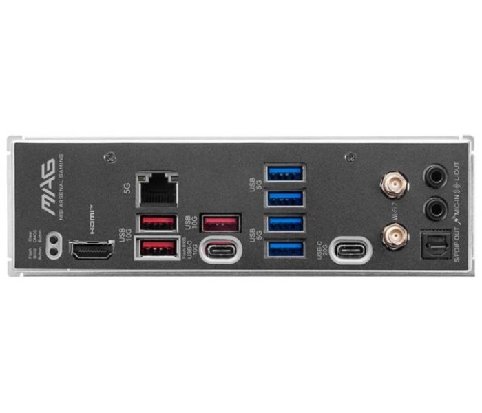 | Puertos E/S, Conectores | Externos - 1 x DisplayPort 1.4- 1 x Puerto LAN 2.5G - 1 x Puerto USB 2.0 - 1 x USB 3.2 Gen 1 5 Gbps Tipo A - 1 x Antena Wi-Fi/Bluetooth - 1 x Conectores de audio HD - 1 x Botón Flash BIOS - 1 x Puerto HDMI 2.1 - 1 x USB 3.2 Gen 2 10 Gbps Tipo A - 1 x USB 3.2 Gen 2x2 20 Gbps Tipo C - 1 x Salida óptica S/PDIF Internas - 1 x conector de alimentación (ATX_PWR) - 2 x conectores de alimentación (CPU_PWR) - 1 x ventilador de CPU - 1 x ventilador de bomba - 6 x ventiladores de sistema - 2 x paneles frontales (JFP) - 1 x intrusión de chasis (JCI) - 1 x audio frontal (JAUD) - 1 x conector de controlador de ajuste (JDASH) - 2 x conectores LED RGB direccionables V2 (JARGB_V2) - 2 x conectores LED RGB (JRGB) - 1 x conector de pines TPM (compatible con TPM 2.0) - 4 x puertos USB 2.0 - 2 x puertos USB 5 Gbps tipo A - 1 x puerto USB 10 Gbps tipo C |
