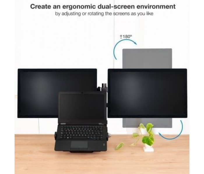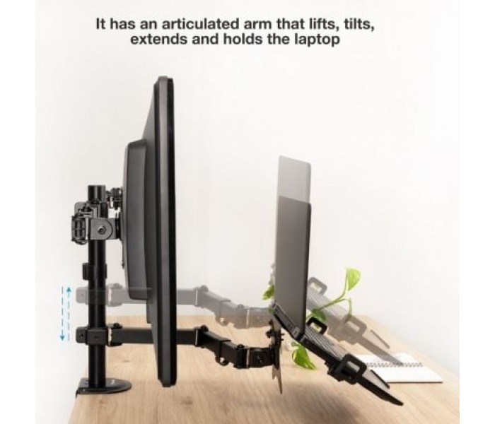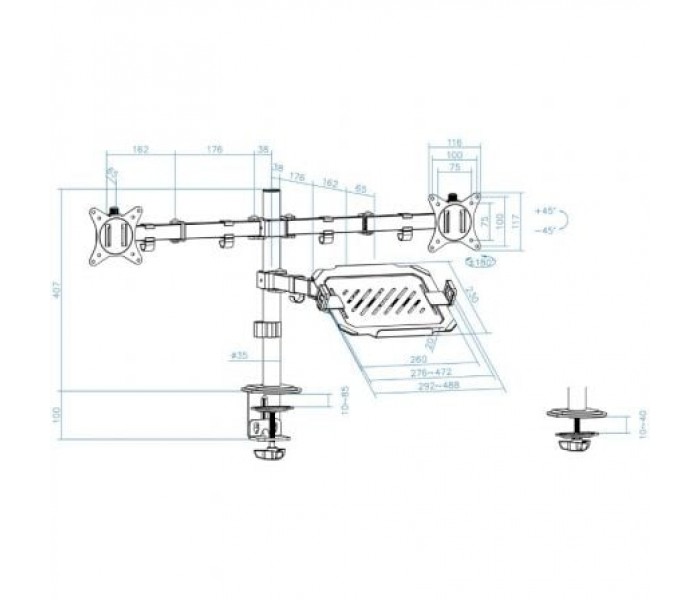 Si eres de los que piensan que dos pantallas se acaban quedando cortas, te presentamos nuestro nuevo soporte con dos brazos articulados y soporte para portátil.. Configura a tu gusto, trabaja a tu gusto.. . Especificaciones:. . Permite instalar 2 pantallas y 1 portátil. Pantallas soportadas: 17""-32"". Compatible con VESA: 75x75 y 100x100. Peso máximo soportado de pantalla: 9 kg por brazo. ángulo de inclinación: +45º/-45º. ángulo de giro: +90º/-90º. ángulo de rotación: +180º/-180º. Altura del bastidor: 407 mm. Diámetro del bastidor: 35 mm. Extensión máxima del brazo: 376 mm. Válido para portátiles de 12"-17". Peso máximo soportado de portátil: 9 kg. La bandeja para el portátil proporciona una buena ventilación y disipación del calor. La bandeja dispone de garras de ajuste de ancho con almohadillas de protección, se ajusta a una gran variedad de tamaños y formas. Instalación mediante abrazadera o tornillo pasante. Sistema de sujeción de cables. Color: Negro. Material: fabricado en acero de alta calidad. Peso neto: 5,40 kg. Peso bruto: 6,40 kg. Medidas del embalaje: 460x315x36 mm