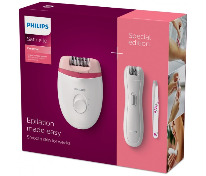- Disfruta de unas piernas suaves durante semanas con Philips Satinelle. Elimina de raí,z el vello de hasta tan solo 0,5 mm con suavidad. Esta edició,n especial incluye una minidepiladora Philips y unas pinzas diseñ,adas para las á,reas má,s sensibles <>