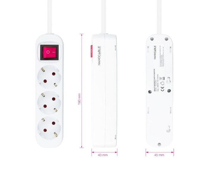 Nanocable presenta la familia perfecta de regletas para uso doméstico y profesional. Disponibles en blanco y negro, con tres, cuatro o seis enchufes. ¿A qué esperas para descubrirlas? . ¿Necesitas enchufar varios dispositivos?. Con nuestra regleta despreocúpate de no tener suficientes enchufes en tu habitación o despacho.. La regleta de Nanocable cuenta con un interruptor ON/OFF. Así podrás desconectar con seguridad todos tus equipos de la red eléctrica.. Elige la regleta perfecta para ti. ¡Además vienen en nuestra característica bolsa reutilizable de Nanocable!. . Especificaciones:. . 3 tomas de corriente con toma de tierra . Protección infantil. Voltaje: 250V-50Hz. Máximo 3.680W . Certificado CE, RoHS, GS y REACH. Color: Blanco. Medidas del producto: 190x40x45 mm