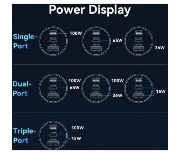 - Salida USB-C1 + USB-C2 + USB-A1: 100W + 15W