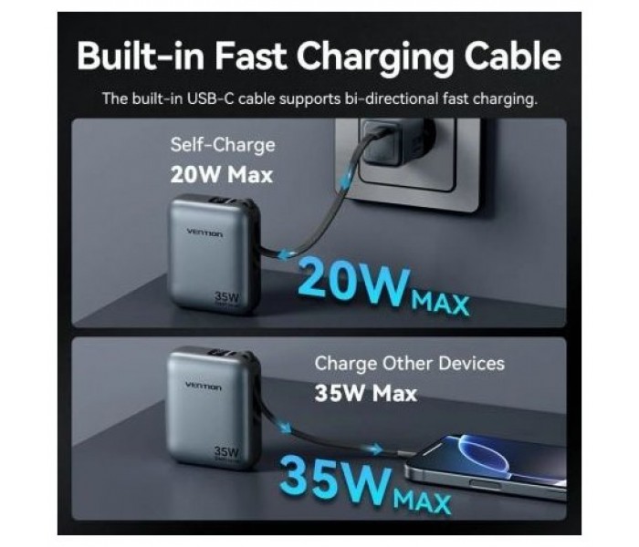 El cable USB-C incorporado y el puerto USB-C admiten carga rápida 35W PD y PPS, ideal para portátiles, tabletas y teléfonos.