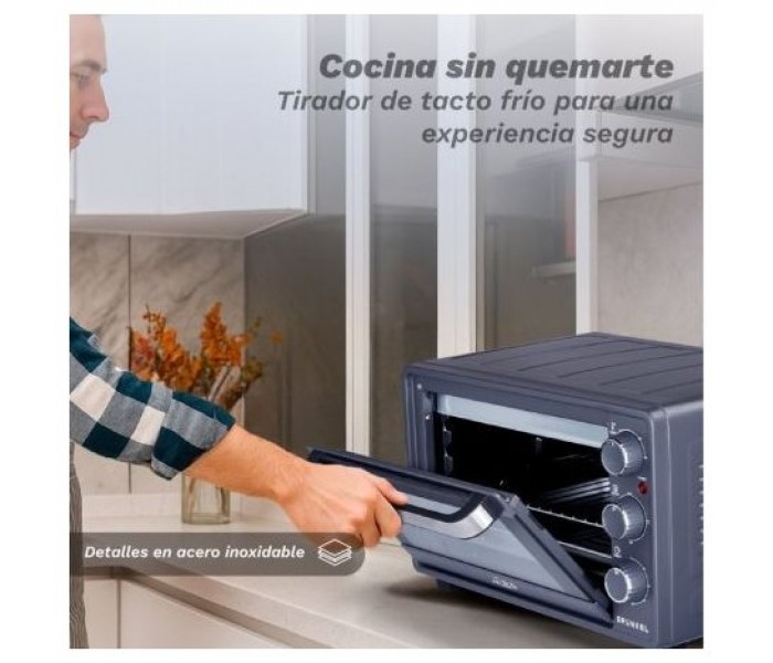 El horno eléctrico de GRUNKEL HR-23EASY es compacto y funcional, ideal para cocinas que buscan eficiencia y diseño en un solo electrodoméstico. Con 1600W de potencia y una capacidad de 23 litros, permite cocinar una amplia variedad de recetas como pizzas, carnes, pescados o postres. Ofrece 3 funciones de calor: superior, inferior o combinadas, que se adaptan a cada tipo de preparación. Su temperatura ajustable de 100 a 230 °C asegura resultados precisos, desde dorados intensos hasta cocciones suaves. El temporizador mecánico de hasta 60 minutos incluye aviso acústico, evitando que te preocupes por el tiempo. Gracias a su tirador de seguridad, se mantiene frío durante el uso, evitando quemaduras. Además, los detalles en acero inoxidable aportan durabilidad y estilo a cualquier cocina. El GRUNKEL HR-23EASY es una solución versátil, segura y potente para cocinar con libertad, control y resultados profesionales en casa.Especificaciones