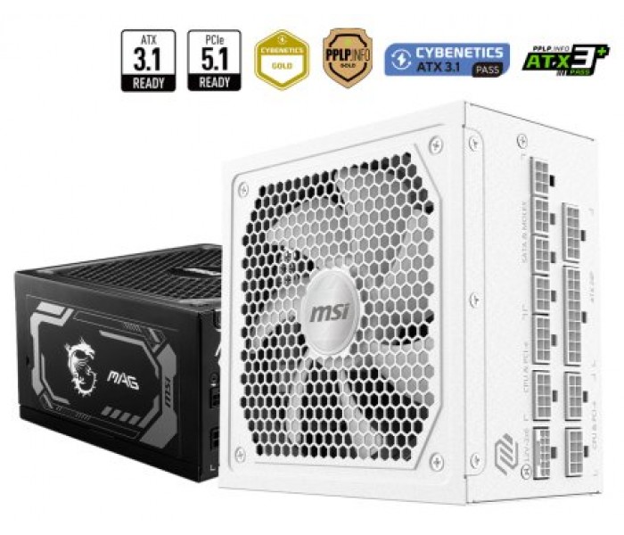 FUENTE ALIMENTACION MSI MAG A1000GL PCIE5 WHITE,PSU,1000W,80 PLUS GOLD,MODULAR,135MM,ACTIVE PFC,PCI-E 5.0 (16 PIN)X1,PCI-E (6+2 PIN)X4,SATA (15 PIN)X12 (Espera 4 dias)