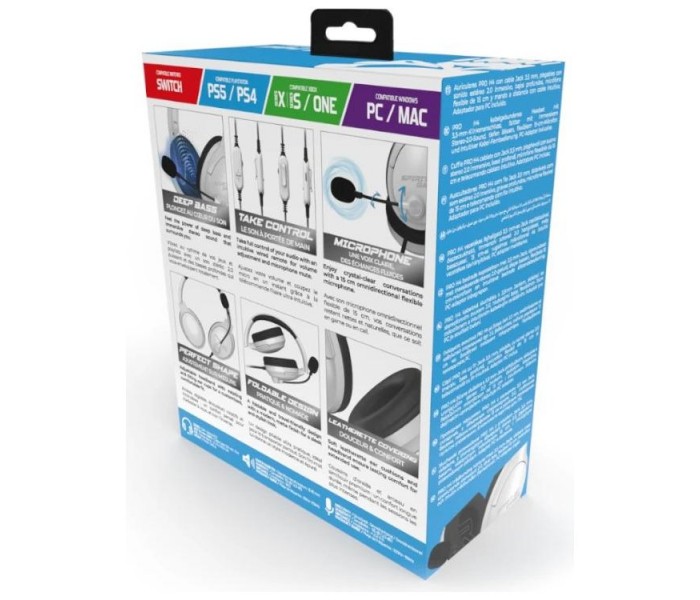 | Caracteristicas | - Plataformas compatibles: Nintendo Switch, PlayStation 4, PlayStation 5, PC y Mac, telefonos inteligentes, Xbox Series S, Xbox Series X, Xbox One - Estandar de audio: estereo, Windows Sonic - Conector secundario: adaptador jack 3,5 mm PC - Tipo de casco: circumaural - Control: mando en cable (volumen +/-) - Sensibilidad de casco: 113 dB (+/- 3 dB) - Frecuencia del casco: 20 ~ 20 KHz - Impedancia del casco: 32 ohmios - Tipo de microfono: omnidireccional, flexible - Sensibilidad del microfono: -35 dB (+/- 3 dB) - Frecuencia del microfono: 20 ~ 20 KHz - Impedancia del microfono: 2 ohmios - Conexion: jack 3,5 mm - Longitud del cable: 2 metros - Color: blanco - Materiales: almohadillas HP, diadema y base de arco Dimensiones y peso - 17 x 9 x 20,5 cm Contenido - Adaptador de PC - Auriculares PRO-H4 - Guia de instalacion rapida |