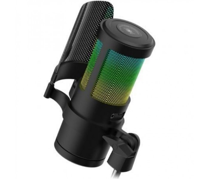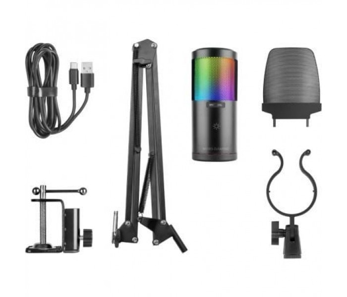 Diagrama polar. Cardioid. SPL. 120dB. Sensibilidad. -45dB±3dB. Rango de frecuencias. 20Hz-20kHz. SNR. 85dB. Corriente. 120mA. Voltaje de entrada. 5V. Conectores. USB (Micrófono) / Jack 3.5mm (Auriculares). Material. ABS. Peso. 332g (soporte) / 130g (micrófono). Longitud del cable. 1.7m. Iluminación. ARGB Flow. Impedancia. <2.2kΩ. Compatibilidad. Windows, Mac, Switch, PS4, PS5. Dimensiones. 141x52x80mm (microphone) / 740mm (arm)