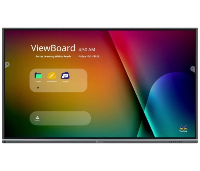 Viewsonic IFP6550-5F. Diagonal de la pantalla: 165,1 cm (65"), Área de trabajo: 1428,48 x 803,52 mm, Brillo de pantalla: 400 cd / m². Sistema operativo instalado: Android, Arquitectura del procesador: ARM Cortex-A73, Frecuencia del procesador: 1,5 GHz. Potencia de altavoz: 20 W, Potencia RMS de subwoofer: 15 W. Ethernet LAN, velocidad de transferencia de datos: 10,100 Mbit/s. Interfaz: HDMI, Conector USB: USB tipo A, USB Tipo B, Auriculares: 3,5 mm