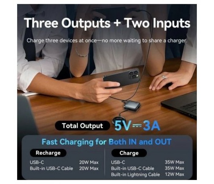 - Salida (cable USB-C integrado): 5V⎓3A; 9V⎓3A; 12V⎓2.92A; 15V⎓2.33A; 20V⎓1.75A (35W Máx)