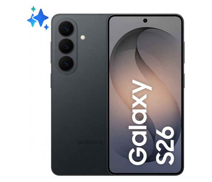 Samsung Galaxy S26 . Diagonal de la pantalla: 16 cm (6.3"), Resolución de la pantalla: 2340 x 1080 Pixeles. Familia de procesador: Samsung Exynos, Modelo del procesador: 2600. Capacidad de RAM: 12 GB, Capacidad de almacenamiento interno: 256 GB. Resolución de la cámara trasera (numérica): 50 MP, Tipo de cámara trasera: Triple cámara. Capacidad de la tarjeta SIM: SIM doble. Sistema operativo instalado: Android 16.0. Capacidad de batería: 4300 mAh. Color del producto: Negro. Peso: 167 g