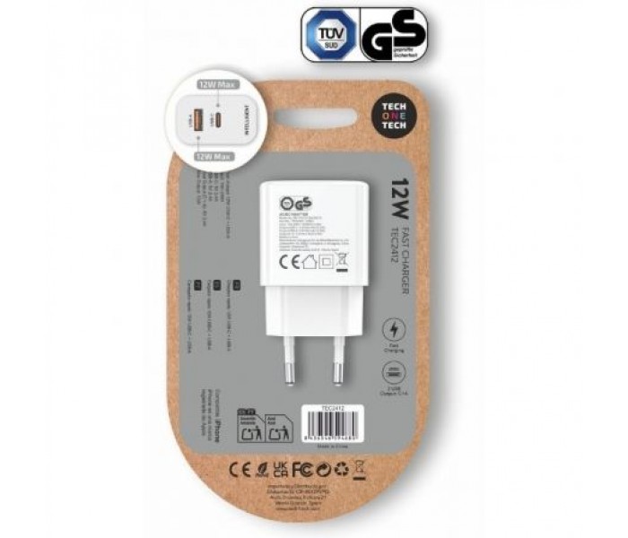 Cargador doble con entrada de 100-240V, dos salidas (USB -C , USB-A).