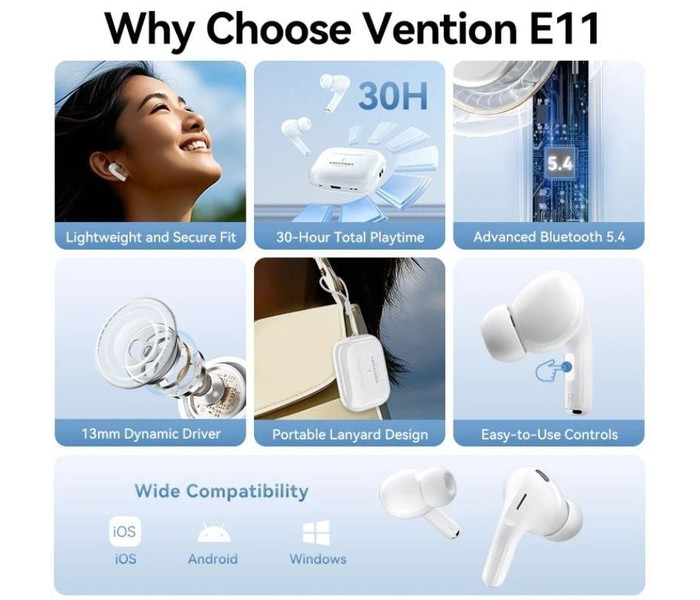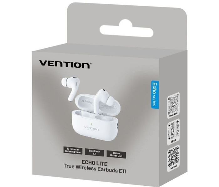 Los Vention ECHO LITE E11 ofrecen una experiencia de audio completamente inalámbrica con Bluetooth 5.4, diseño compacto y compatibilidad con códecs SBC y AAC. Son ideales para uso diario, con un estuche de carga USB-C y materiales duraderos en ABS.Conectividad Bluetooth 5.4