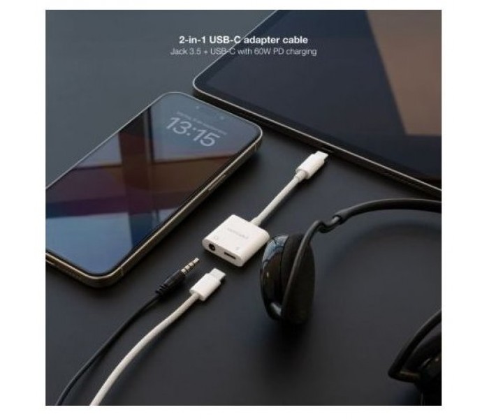 Cable adaptador 2 en 1 de USB-C macho a Jack hembra + USB-C de carga hembra.