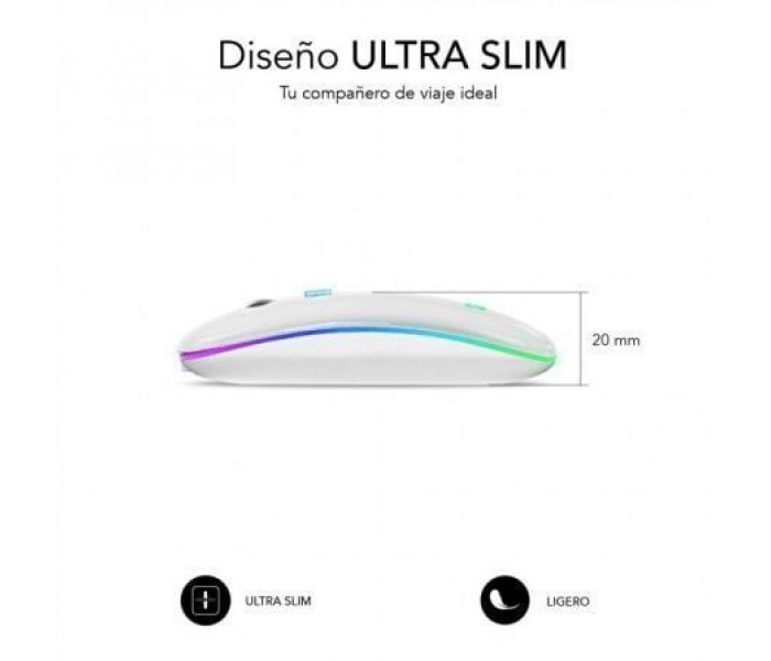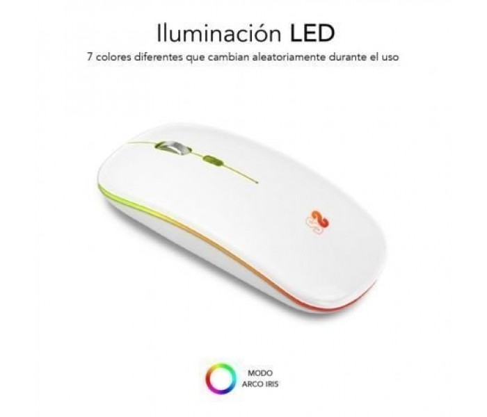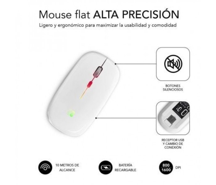 Este ratón es de los más completos del mercado. Es dual, lo que permite conectarlo a dos dispositivos usando la conexión bluetooth o el receptor USB. Incluye la tecnología Silent Click para hacerlo silencioso y útil en entornos con otras personas. Además incluye una iluminación led en 7 colores que irán cambiando aleatoriamente durante su uso para que la experiencia sea inmersiva. La batería es integrada y de larga duración para interferir lo menos posible con tu ritmo de trabajo.Dos conexiones en un mismo ratón. Sin duda estamos ante uno de los ratones más completos del mercado. La tecnología dual permite que podamos conectarlo tanto por radiofrecuencia con un receptor USB como por bluetooth, pudiendo llegar a conectar dos dispositivos.Silent Click. El Led Dual Flat Mouse es silencioso para poder llevarlo a cualquier sitio, desde tu trabajo, un centro de estudio, tu casa. La tecnología Silent Click soluciona el molesto clic repetitivo del ratón que puede llegar a desconcentrarnos, los botones del ratón son silenciosos.Batería Li-ion Recargable. Sin necesidad de pilas, para que te puedas olvidar de ellas. Esta batería de 500 MHa es de larga duración. Además, nunca te quedarás sin ratón porque puedes seguir trabajando mientras se recarga la batería por USBRueda metalizada. Disfruta de las mejores sensaciones con la rueda antideslizante de diseño metalizado. Resulta muy cómoda y tiene un tacto agradable.Luz led. El detalle de luz del ratón Led Dual Flat es ideal para completar el diseño de tu escritorio o despacho o incluso para llevártelo a cualquier parte y aportar un toque de color. Resulta ideal para entornos con una baja iluminación gracias a los 7 colores que cambian aleatoriamente mientras se usa creando un entorno relajanteMáxima precisión. Úsalo en múltiples superficies con alto rendimiento y excelentes resultados, adapta la precisión para trabajar a tu gusto. Cuenta con un sensor óptico con precisión láser de 1600 dpi que proporciona un movimiento suave y sin saltos.Ahorro de energía. Después de un tiempo de inactividad, el ratón pasará automáticamente al modo suspensión para ahorrar batería, así no tendrás que preocuparte por encenderlo o apagarlo cada vez que lo uses. Para activarlo, presiona cualquier tecla y vuelve al trabajo.