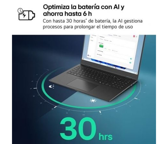 Gracias a su batería de 72 Wh y el uso eficiente de energía, el LG gram puede alcanzar hasta **30 horas de autonomía** en condiciones ideales. Además, incorpora puertos modernos y versátiles, como Thunderbolt 4, HDMI 2.1 y USB 3.2, junto a conectividad inalámbrica de última generación.