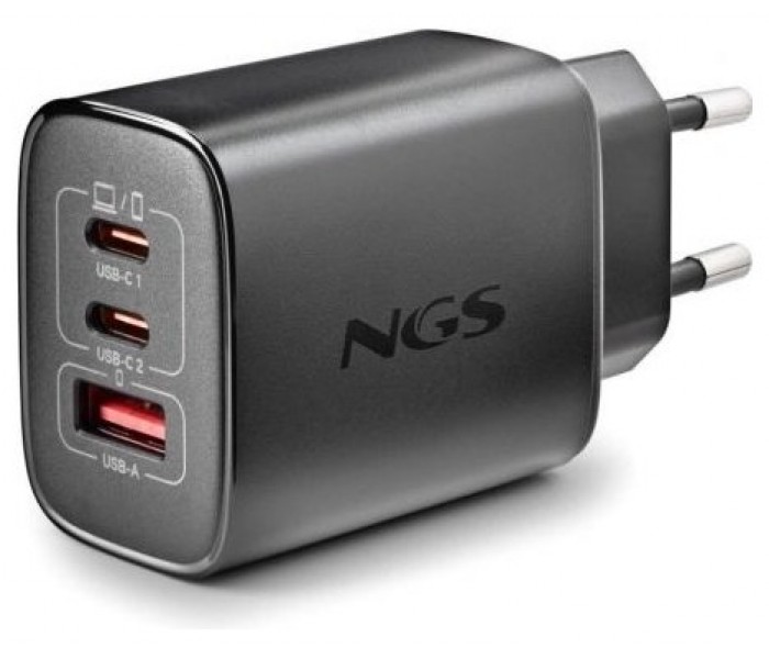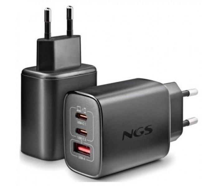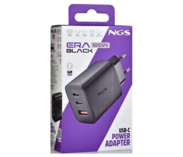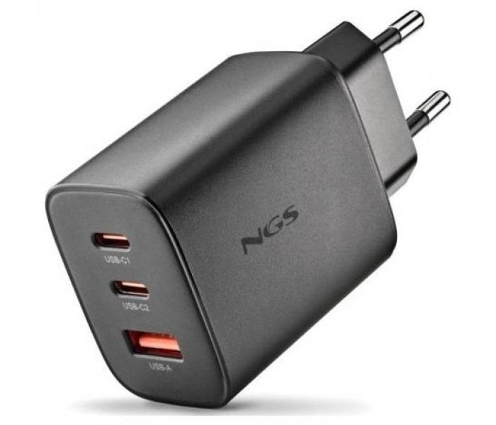 Cargador de Pared GaN NGS Era 65W/ 2xUSB Tipo-C/ 1xUSB/ 65WERA 65W BLACKCargador GaN de pared ultrar..