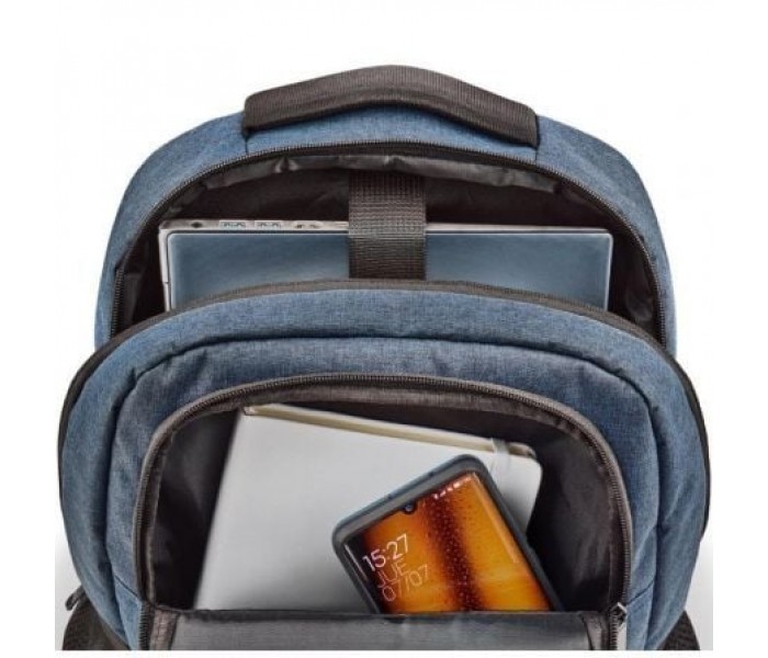 Mochila protectora para portátil de hasta 15,6"" en color azul oscuro jaspeado (450x350mm).. Gran capacidad para el almacenamiento del día a día.. Suave acolchado interno para una máxima protección.. Incluye un bolsillo externo en el que puede guardar y proteger sus accesorios y tener un acceso rápido.. Se fija al equipaje con ruedas gracias a la correa de sujeción que incorpora.. Fabricada con tejido de alta calidad, resistente al agua, antiarañazos, a prueba de golpes y ligera.. Práctica y universal, adecuada para diferentes objetivos ypropósitos.. Tiene dos bolsillos laterales de malla para guardar botellas de agua y paraguas plegables, que garantizan el orden y facilitan la búsqueda de tus objetos.. . Especificaciones:. . Color azul oscuro jaspeado . Tejido de poliéster de alta calidad, resistente al agua y antiarañazos . Suave acolchado interno para una máxima protección . Amplio bolsillo exterior . Dos bolsillos laterales de malla