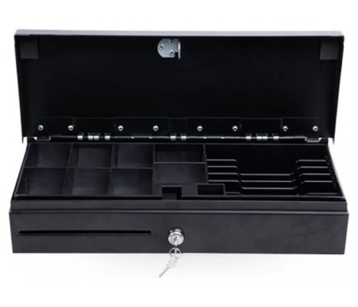 Cajón de tamaño reducido (330 x 335 x 90 mm). 8 compartimentos de monedas y 4 de billetes.Apertura e..