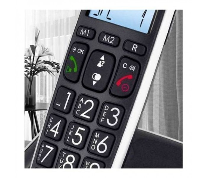 | Características | Datos técnicos - Compatible con audífonos - Amplificación extra del volumen del auricular de +10dB - Agenda de 20 nombres y números - Manos libres - Modo ECO - Identificación de llamada en espera - Listado de llamadas recibidas: 10 posiciones - Listado de llamadas realizadas: 5 posiciones - Mensaje en espera - Pantalla iluminada en color azul - Nombre del portátil configurable - Tiempo de conversación en pantalla - Indicador del estado de la batería - Indicador de cobertura - 5 niveles de volumen del auricular - 5 niveles extra de volumen de auricular (amplificación) - 5 niveles de volumen del manos libres - Timbre en portátil - 6 niveles de timbre para el portátil (incluido silencio) - Indicador audible de batería baja - Indicador audible de fuera de cobertura - Teclas grandes - Marcación en colgado - Marcación turbo - Bloqueo de teclado - Descolgado automático configurable - Teclado sonoro configurable - Tecla Pausa - Tecla R configurable - Tecla de encendido y apagado del portátil - Teclas de memorias directas: M1 y M2. - Alto: 177 mm. - Ancho: 57 mm. - Grosor: 27 mm. - Peso: 156 g. Funcionalidades GAP - GAP compatible - Número de portátiles que una base puede soportar: Hasta 5 - Número de bases en las que un portátil se puede registrar: 4 - Transferencia de llamadas entre portátiles - Llamadas internas entre portátiles - Conferencia a tres: 2 internas y 1 externa Otras - Idioma seleccionable: Español, Türkçe, Svenska, Norsk, Suomi, Dansk, English, Nederlands, Français, Italiano y Deutsch - Función alarma - Ajuste de fecha y hora - Número PIN configurable - Función Reset - Búsqueda del portátil desde la base - Indicador luminoso en portátil en presencia de timbre y cuando la función amplificación está activada - Tipo de marcación seleccionable: tonos o pulsos - Conexión telefónica RJ11 - Compatible con las redes telefónicas analógicas Españolas |