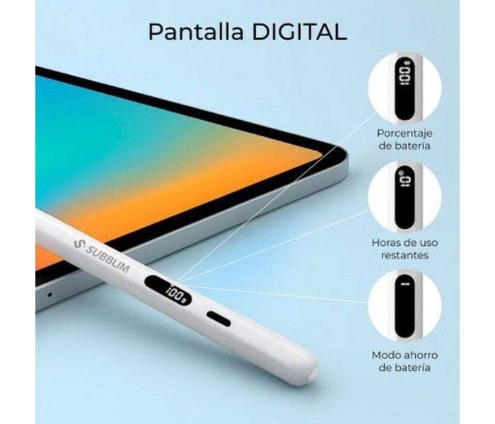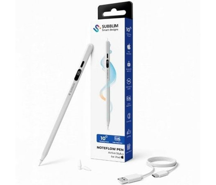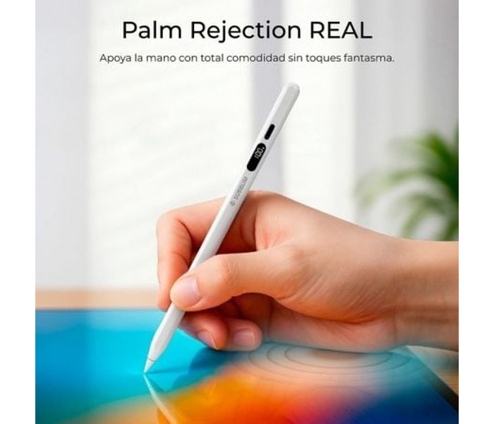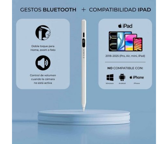 Escribe y dibuja como en papel en tu iPad. NoteFlow Pen for iPad combina Palm Rejection para apoyar la mano sin toques fantasma y sensibilidad a la inclinación para sombrear o variar el grosor con un gesto natural. La punta POM de 0,9 mm ofrece control fino y deslizamiento suave, incluye 2 repuestos para mantener siempre un trazo consistente. (Especificaciones según hoja de producto).Mantén el control del tiempo con su pantalla digital: muestra el % de batería, las horas de uso restantes y el modo de ahorro para evitar sorpresas en clase o reunión. Con hasta aprox. 10 h de autonomía por carga y USB-C con recarga ?30 min, el lápiz acompaña tu jornada sin atarte a un enchufe.Acelera tu flujo con gestos Bluetooth: doble toque para volver a Inicio, hacer zoom o tomar una foto, cuando no usas la cámara, los botones pueden controlar el volumen. Empareja en Ajustes > Bluetooth como ?Pencil?, solo la primera vez.Compatibilidad amplia: iPad Pro (incl. 2024 11"/13"), iPad Air 3?7 (incl. 6 11"/13"), iPad mini 5?7 e iPad 6?11. No compatible con iPhone, Android, Windows ni iPad anteriores a 2018.Incluye: NoteFlow Pen, cable USB-C, manual y 2 puntas. Especificaciones: batería Li-Po 130 mAh, entrada 5 V/200 mA, USB-C, temp. de trabajo 0?35 °C