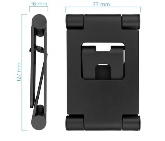 | Características | - Soporte de mesa ajustable y giratorio para teléfono / tablet de hasta 10” - Material: Fabricado en aleación de aluminio - Dispone de almohadillas de silicona antideslizantes, para proteger de arañazos y deslizamientos. - Plegado compacto del soporte para facilitar su guardado y transporte. - Medidas del producto plegado: 77 x 127 x 16 mm - Color: Negro - Peso: 0,218 kg |