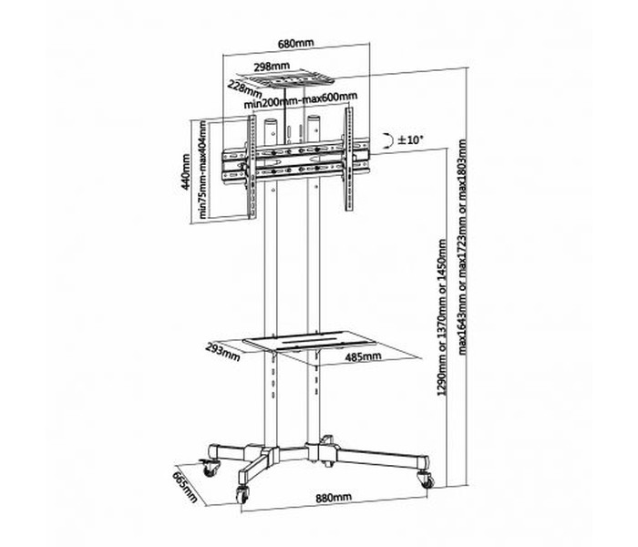 - Angulo de Inclinación: -10º / +10º. Altura máxima del soporte: 1803mm. Rango de ajuste para la altura del soporte TV: ajustable entre 1290 y 1450mm